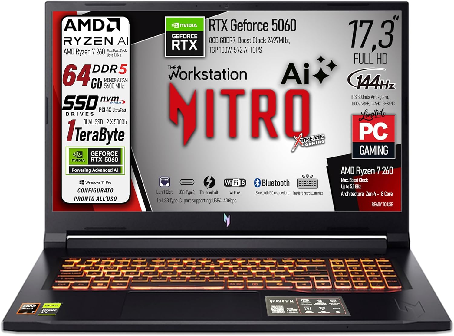 acer Notebook Gaming Nitro V17 Ai, Ryzen7 260, Ram 64Gb ddr5, SSD da 1Tb 500Gb X 2 , Display 17,3 pollici FHD IPS 144Hz, NVIDIA GeForce RTX 5060 8Gb GDDR7, Wi-Fi 6e, Thunderbolt 4.0, Win 11Pro, Ready to use