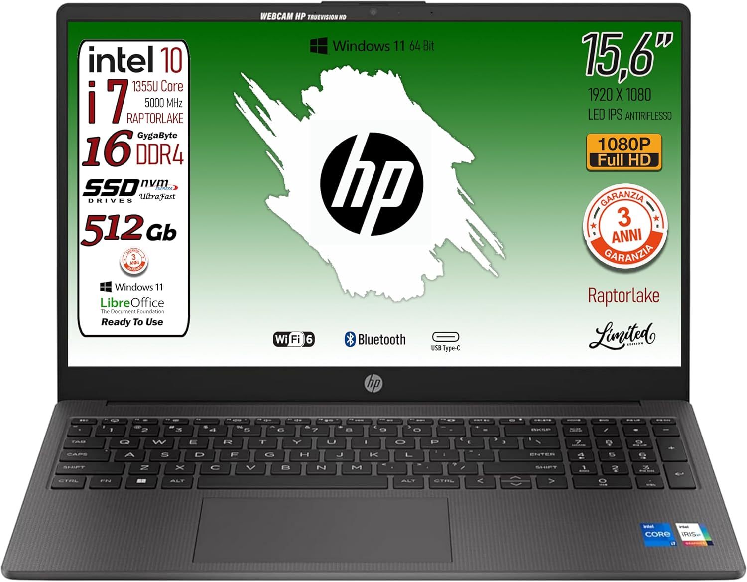 HP 250 G10, PC Portatile CPU Intel Core i7-1355U 13th 10Core, fino a 5 GHz, RAM 16Gb, SSD Pci 512Gb, Display 15.6 pollici ips FHD, Wi-Fi 6, BT, WebCam, HDMI, Win 11, Pronto allUso, 3 Anni di garanzia